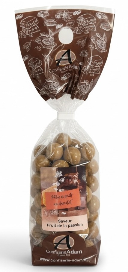 Une pâte de fruits moelleuse fruit de la passion enrobée de chocolat fondant. Un doux plaisir fruité.