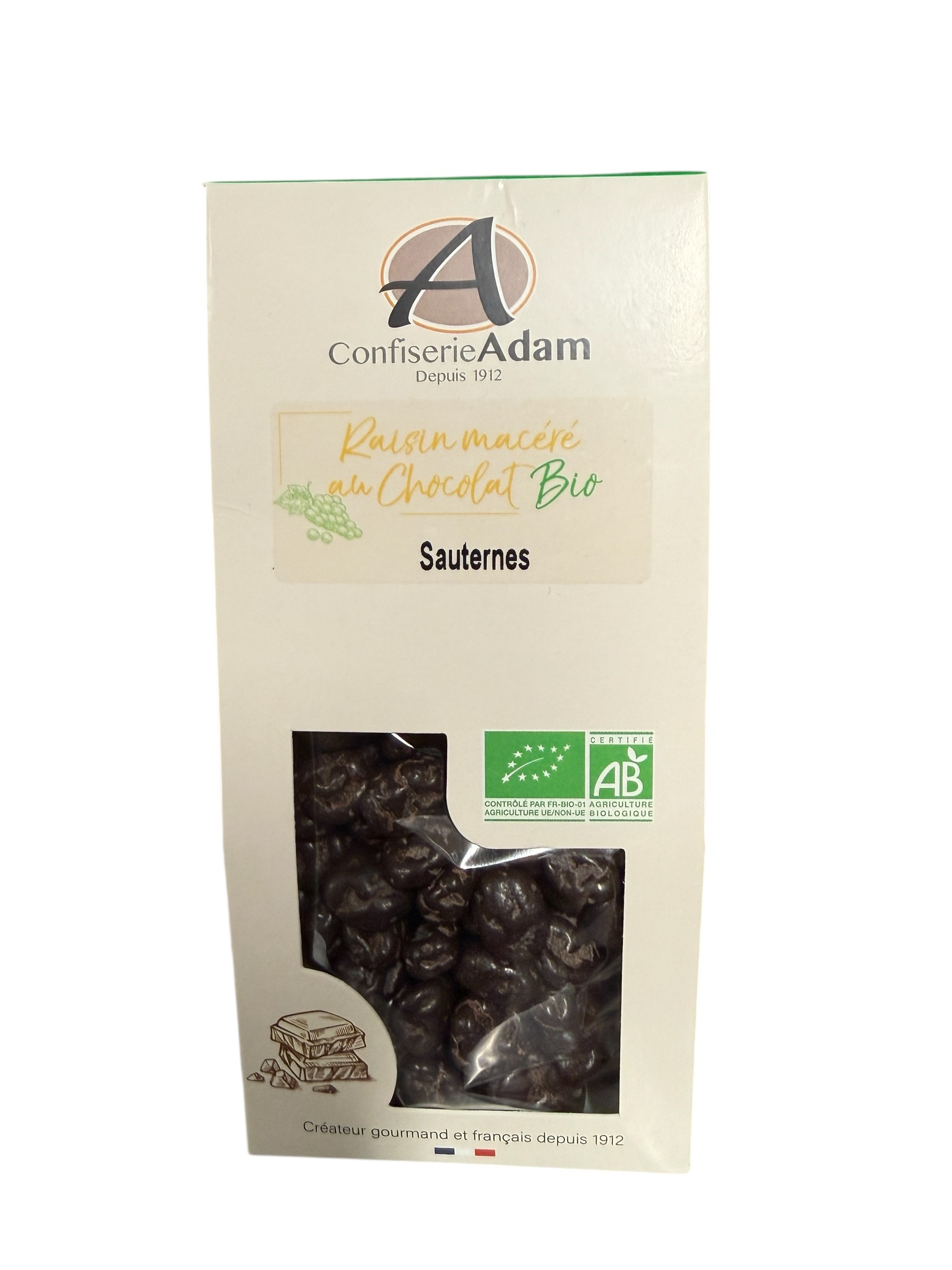 L’alliance d’un raisin macéré au Sauternes et du chocolat noir. Une gourmandise raffinée et Bio.